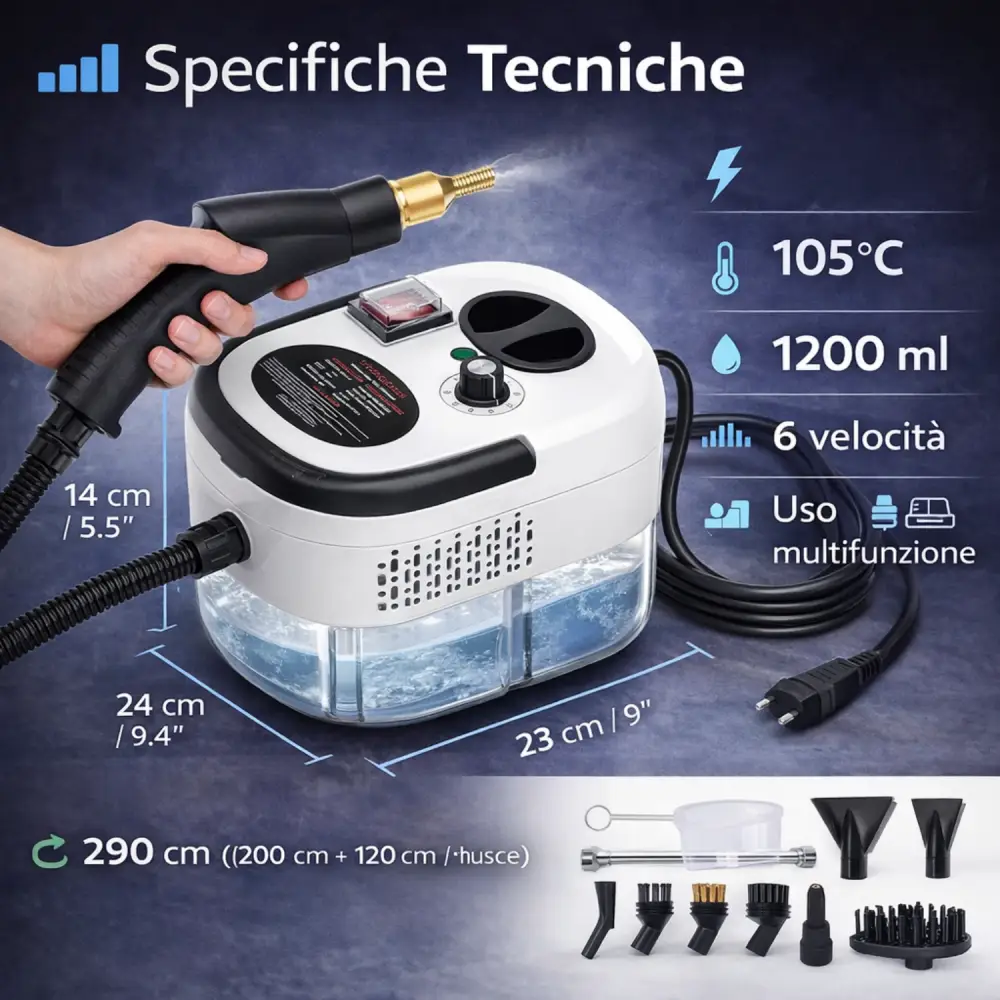 Trasforma il modo in cui pulisci casa e auto con il Pulitore a Vapore 1,2L Professionale. Ideale per eliminare grasso da cucina, calcare, sporco ostinato, muffa e batteri, garantisce una sanificazione profonda utilizzando solo la forza naturale del vapore.